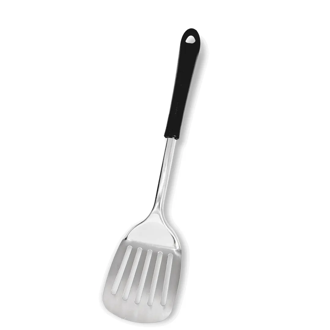 Espátula 100% inoxidable con mango negro.